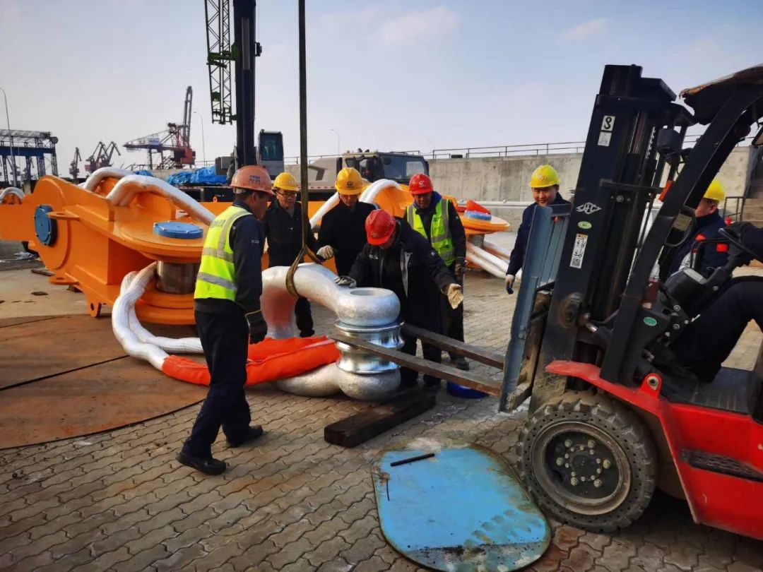 为确保防撞钢套箱的顺遂吊装,巨力索具名目团队主动与青龙门大桥名目部对接交换,供给吊梁、卸扣、高强环形吊索等2400T钢套箱吊具,降服功课情况带来的困难,从专业角度共同实现吊装。