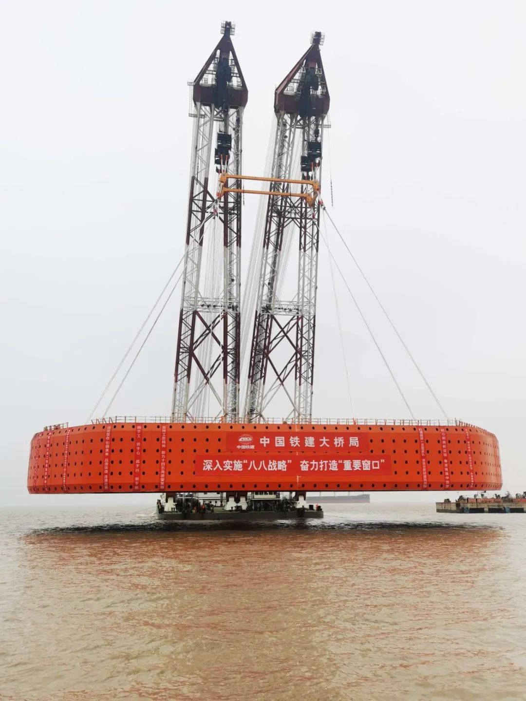 克日,青龙门特大桥主塔防撞钢套箱顺遂吊装上船,为下一步钢套箱的全体装置做好了筹办。巨力索具为其供给定制化吊装产物及专业化吊装计划,全部吊装进程宁静有序可控。